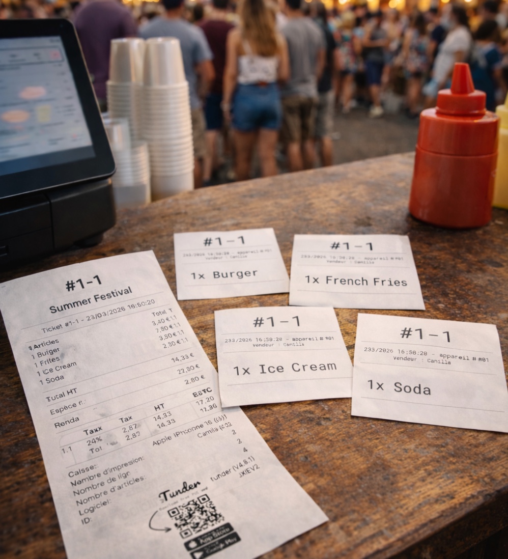 Each ticket allows the customer to pick up their product directly at the stand concerned (drinks, fries, sandwiches, etc.).